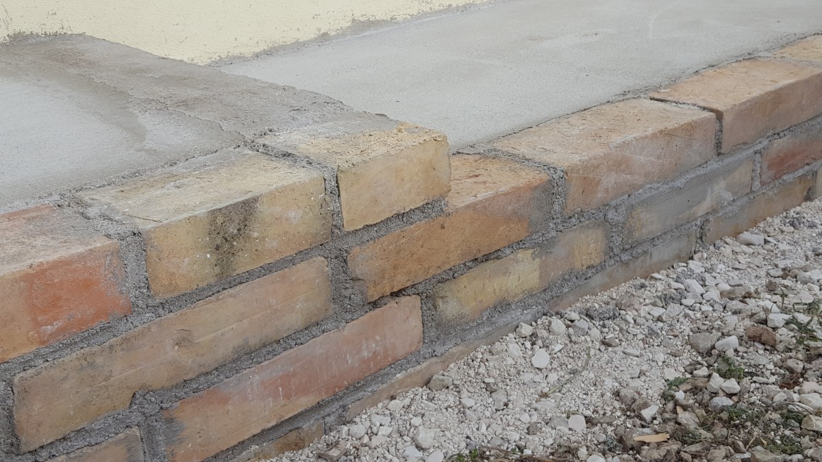 And go they did, crumbling away alarmingly easily with little more than a nudge from Mr Blue-Shirt’s heavy-duty breaker. Having carefully pegged and stringed out the properly established angles, he then set about digging foundations for the new brickwork – no mean feat in the rock-solid Marche mud – and sinking the downpipes that had until then simply spewed their contents onto the driveway. Then came the brickwork itself. Although the previous owners had never got round to realising their plans for the outside for the property, they had, luckily for us, accumulated a huge but random collection of building materials and equipment – including several hundred salvaged bricks, so once Mr Blue-Shirt had shovelled from the van the several hundred kilos of sand and cement he had sourced from the local quarry, he was ready for the off. Installing countless metres or ironwork over the years gave Mr Blue-Shirt plenty of experience in general building work, so although he may lack a professional bricky’s speed, laying a few courses of bricks was just like old times and the ever-capable Mr Blue-Shirt was as happy as a pig in muck. So in just a few days, he had built the edging for the new steps and the section of terrace that will run along the front of the outside stairs to the doors to the boiler room. The equipment we had inherited from the previous owners included a tatty but functioning cement mixer, so once the brickwork was dry, back-filling the space with concrete was a relatively quick, if noisy, task. What took the time, though, was achieving a flat and even surface with just the right amount of ‘fall’ for drainage purposes, but never a fan of the ‘that’ll do’ approach to workmanship, Mr Blue-Shirt smoothed and skimmed and levelled until he achieved a finish normally reserved just for wedding cakes. But I am assured that this is the standard of finish required if we want the tiles (which we had also acquired from the previous owners) to sit evenly, which of course we do. But first we need to wait a few weeks for the concrete to dry out fully…