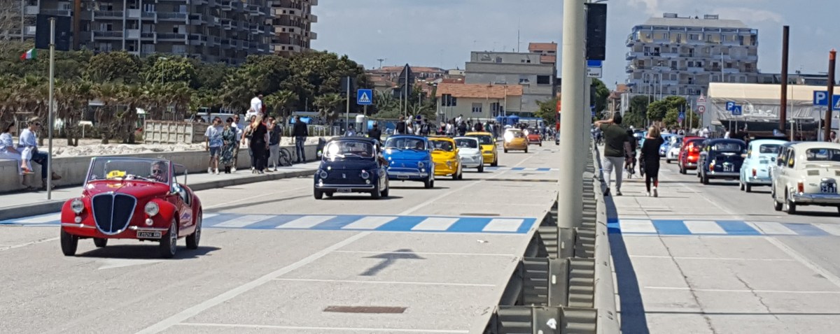 Lower than a Tory politician’s poll ratings; lower than the UK’s entry in the Eurovision Song Contest; lower than a snake’s belly. That’s pretty much where our spirits have been since the burglary, and what with the uncharacteristically cool, wet and windy weather of late, gloom has reigned. So when someone finally switched the summer on, a run down at the beach was just the tonic I needed. However, what really put a smile back on my face was not the irresistible combination of dazzling sunshine and sparkling sea. It was bumping into this year’s Festa del Cinquino – the Fiat 500 Owners’ Club’s annual get-together – just as the fifty or more exhibitors moved off from the main square for their parade lap of the town centre, sea front and port. A tour that effectively brought the place to a halt as practically the whole town stopped to watch, wave, cheer, toot and take photos. So here is a reminder from last October of why this sight did so much to lift my mood…