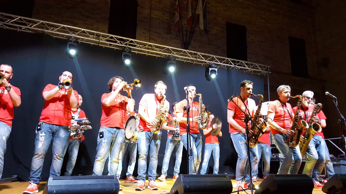And four years on, the sheer joie de vivre of their performance on a balmy, jasmine-scented summer’s evening in Montecassiano was just as infectious. They formed up in the far corner of the central square, barely noticed by the crowds of people grazing from the various food and drink stands around the perimeter. Having tuned their instruments and exchanged high-fives to get themselves in the groove they simply set off through the town, dipping and bobbing to their own beat. But like a band of funky pied pipers, they quickly gathered a stream of followers – including us – as they wove back and forth through the narrow lanes. Their crunchy jazz harmonies echoing among the tall palazzi and tightly-packed townhouses, they paused occasionally in a square for a bit of fancy footwork, or on a street corner for a solo saxophone riff, and, by now trailing a hundred or so people behind them, finally bopped back down into the central square and up onto the stage for what was billed as their ‘static’ set, but which was in fact anything but. And once again we were treated to an hour-long life-affirming, spirit-lifting tour de force. Hand-clapping, finger-clicking, head-bobbing, foot-tapping, thigh-slapping – and that was just the audience, that had now grown to several hundred people, every single one of us (yes, even Mr Blue-Shirt) boogying along to the irresistible beat.