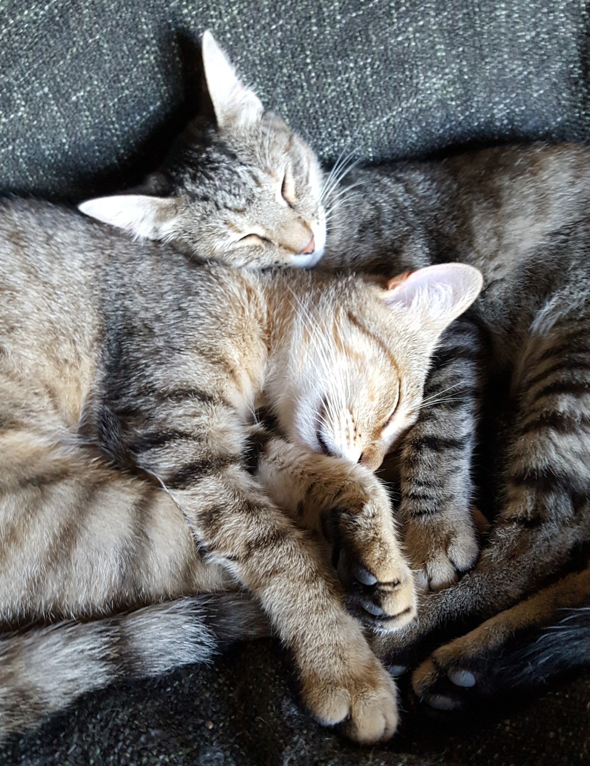 I reckoned that they couldn’t have spent any more than three or four hours apart since they had been born barely a year earlier. As tiny kittens they had suckled together from their mother and developed their cat-craft together as part of an extended family of siblings and cousins. When they first came to us as four- or five-month-old juveniles, they comforted their own and each other’s fears and anxieties at all the unfamiliarity by cuddling up side by side like a pair of tabby slippers in a succession of refuges, peering out at us from two pairs of golden, suspicion-filled eyes. First it was the dining chair in the far corner of the dining room where we spent long spells kneeling under the dining table trying to coax them out. When they had gained a little more confidence, they graduated to one of the armchairs in the snug or the leather-covered stool on the landing, although they mostly still shrank from our touch. As their confidence grew, they started to join us in the sitting room, Mr Blue-Shirt and I on one sofa and the two of them on the other to start with, and gradually allowed us to stroke and scritch them – although not yet to hold or cuddle them. And so it progressed over the tail-end of winter, testing boundaries, testing themselves and testing us – but always as a pair; each always the other’s wingman, back-up, watch-out and fall guy.