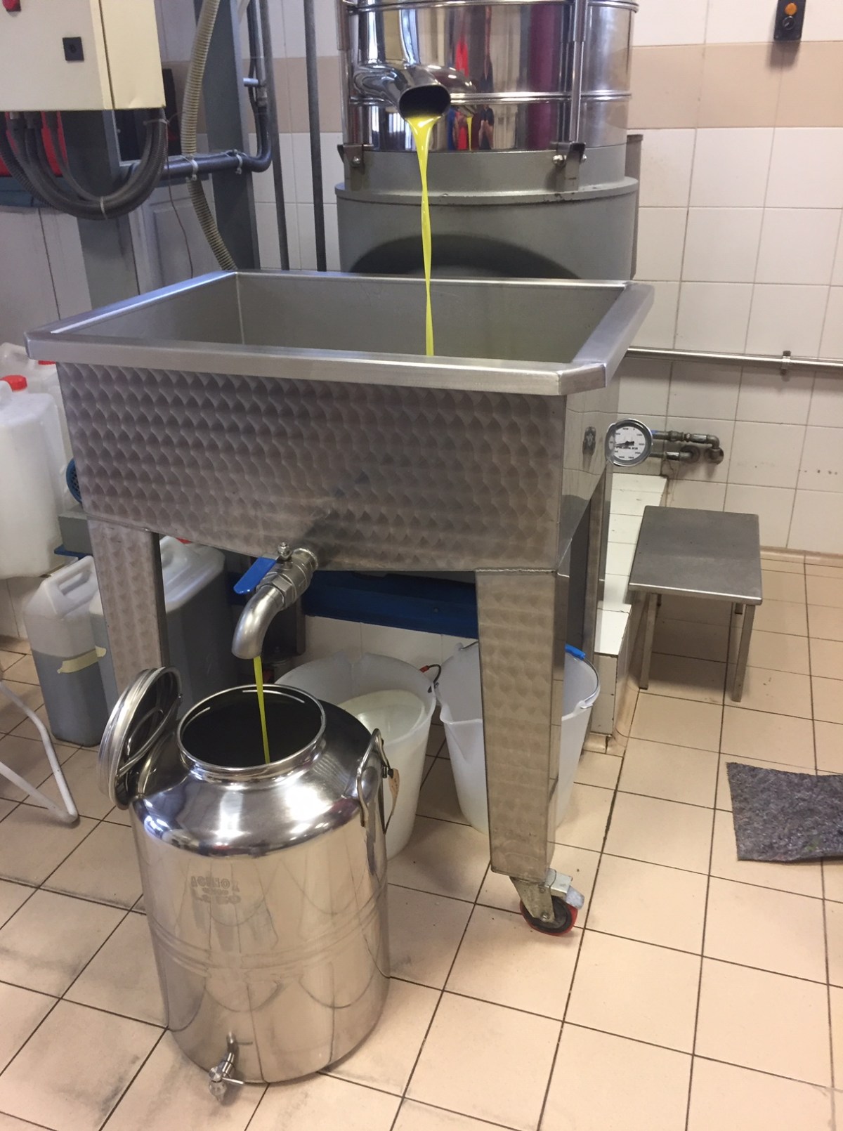 “Yes, there were still quite a lot of solids in there at that point – pulp, skin, bits of pip and so on. So to get rid of them the oil is pumped into a centrifuge that separates the sediment from the oil. It spins at 7000 revolutions per minute, and so when it poured into our flagon that Rodolfo had already positioned below the spout, it had finally started to look like olive oil.”